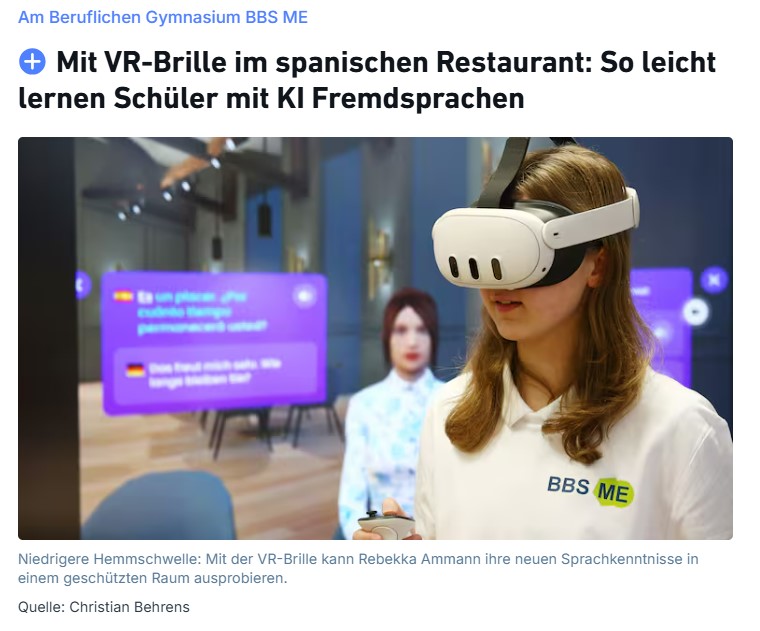 Die Hannoversche Allgemeine Zeitung (HAZ) hat kürzlich über ein besonderes Unterrichtsprojekt an der BBS ME berichtet: Im Spanischunterricht tauchten unsere Schülerinnen und Schüler mithilfe von Künstlicher Intelligenz (KI) und Virtual Reality (VR) in eine realitätsnahe Alltagssituation ein – das Bestellen im Restaurant.