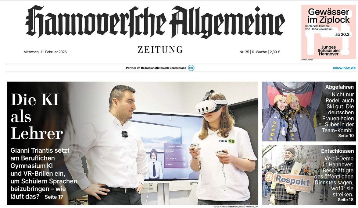 Die Hannoversche Allgemeine Zeitung berichtete über ein innovatives Unterrichtsprojekt, bei dem Schülerinnen und Schüler mithilfe von Virtual-Reality-Brillen und KI-gestützten Sprachtools Spanisch in realitätsnahen Situationen üben.