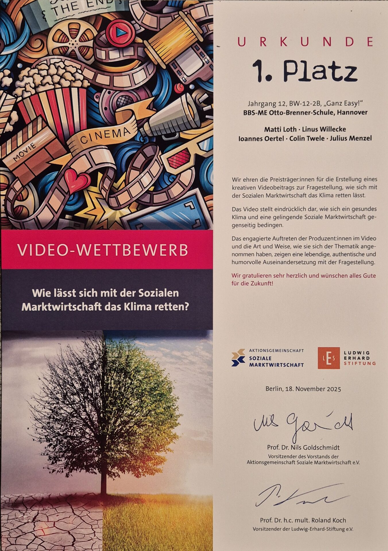 Fünf Schülerinnen und Schüler des 12. Jahrgangs – Ioannis Oertel, Colin Twele, Linus Willeke, Matti Loth und Julius Menzel – haben beim bundesweiten Wettbewerb zum Thema „Wie lässt sich mit der Sozialen Marktwirtschaft das Klima retten?“ den 1. Platz belegt. Für ihren kreativen und überzeugenden Videobeitrag erhielten sie 1.000 Euro für ihre Abikasse.